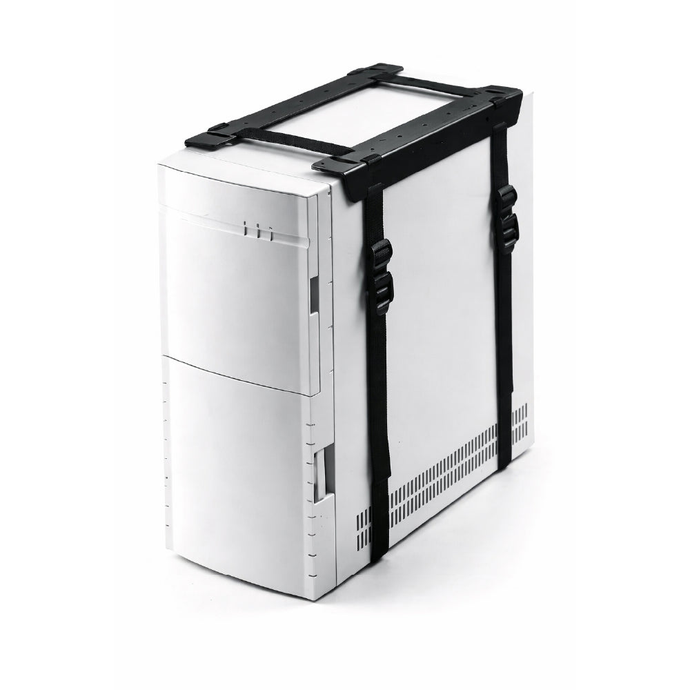 This version uses a rigid steel mounting frame with anti-skid straps, offering a more secure and durable solution than fabric-only CPU slings. Designed for vertical mounting beneath desks, it keeps the CPU stable while allowing straightforward access to rear ports and cabling for everyday use and maintenance.